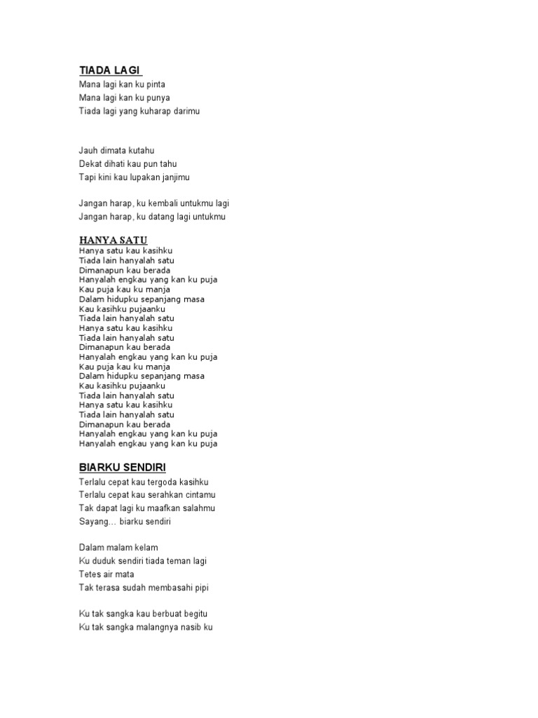 F bila itu yang harus terjadi g dengan besar hati. Music lirik tiada lagi 100% free! Tiada lagi yang ku harapkan tiada lagi yang ku impikan biar aku sendiri tanpa diri mu tiada lagi kata cintamu takkan lagi ku bersama mu biar ku simpan semua kenangan ku bersamamu. A e tiada lagi luka di hatiku d a sejak kau kembali padaku. Tiada lagi mana lagi kan ku pinta, mana lagi kan kupuja tiada lagi yang kuharap darimu mana lagi kan kupinta, mana lagi kan kupuj.